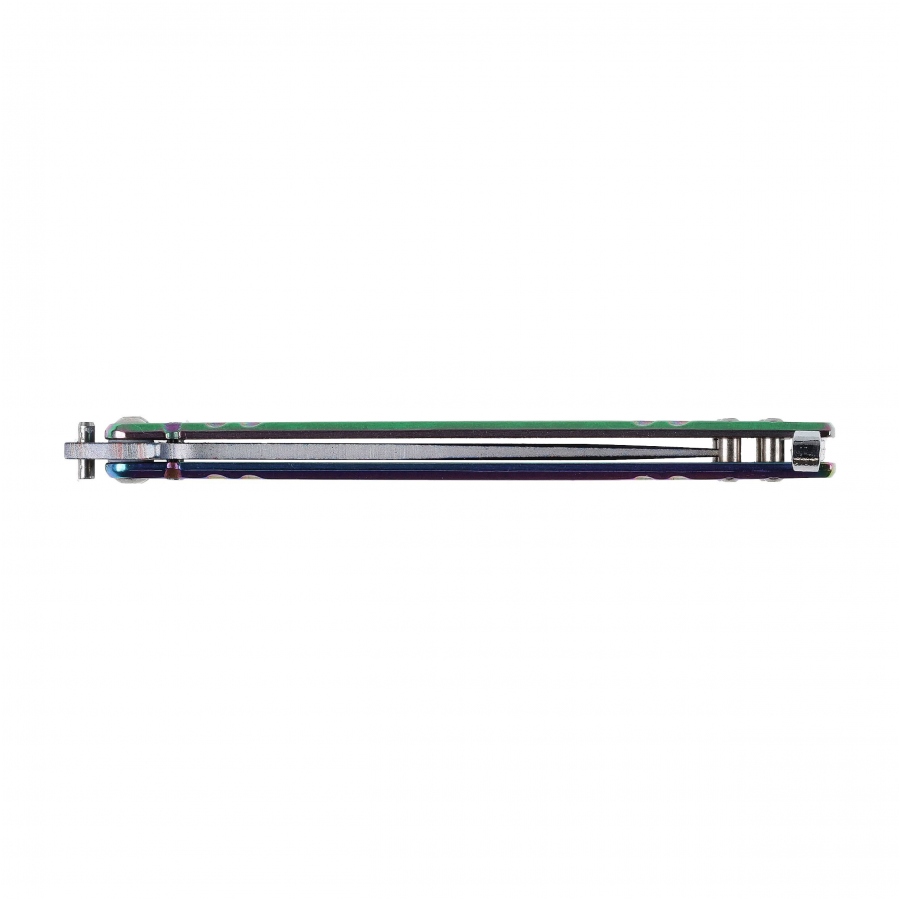 Дръжките са алуминиеви, с опалезиращо покритие, което придава завладяващ визуален ефект. Механизмът използва лагерно движение, което осигурява плавно отваряне/затваряне и възможност за изпълнение на трикове. За безопасност ножът е оборудван с latch блокировка, която фиксира дръжките в затворено положение.